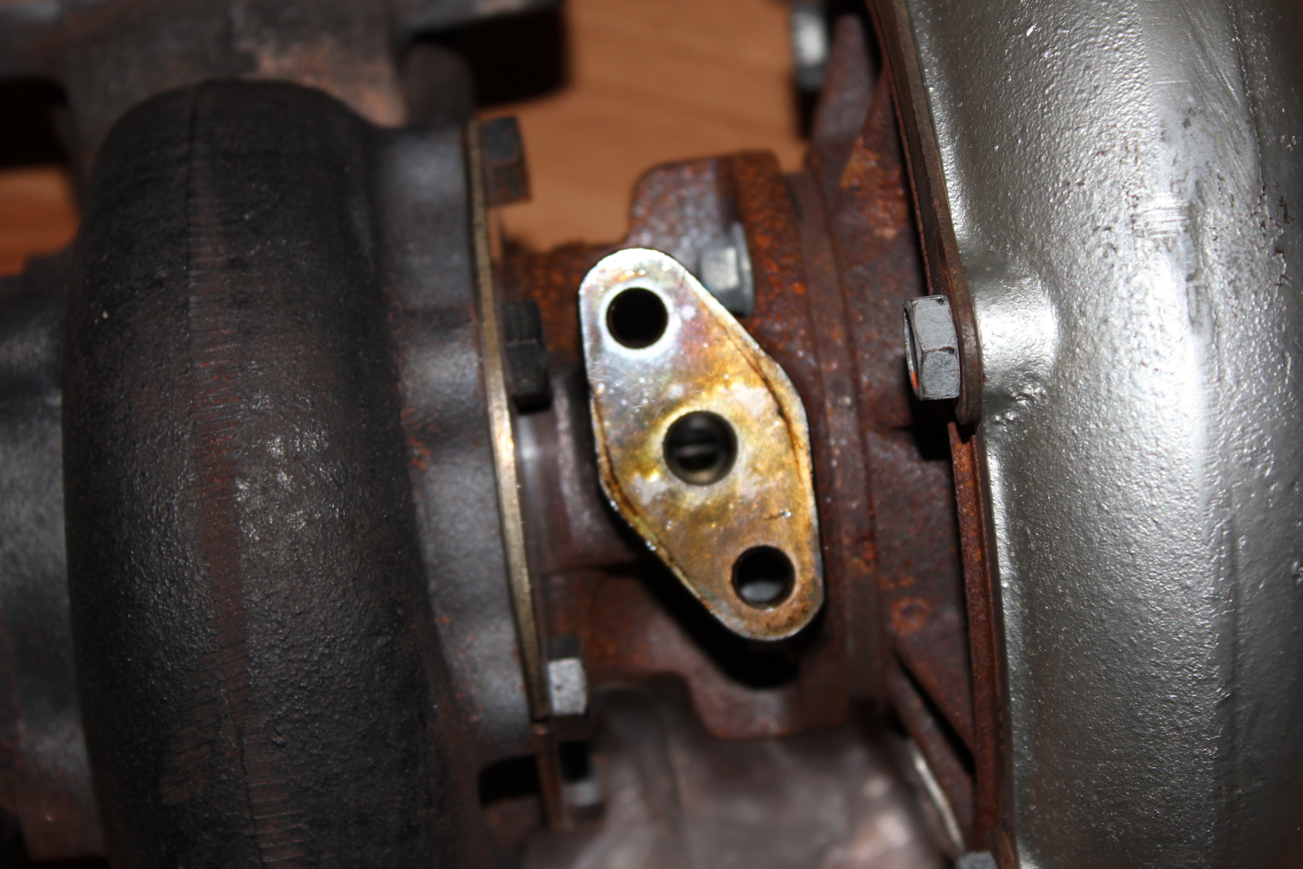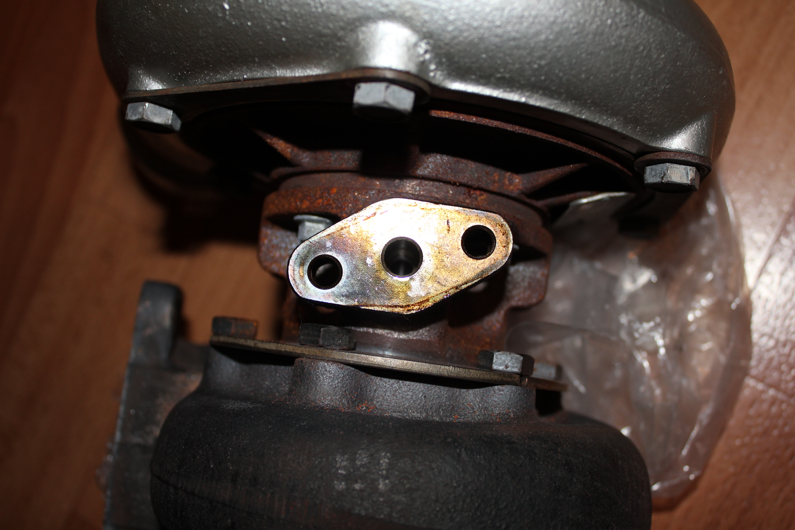 сфотай свою турбину в том месте где прикручивается масло подача. Вот на этой фото видно чем я обмотал масло подачу собственно у меня там все так обмотано и подача тосола и вакумные шланги на вестгейт, рулевая рейка и та обмотана была