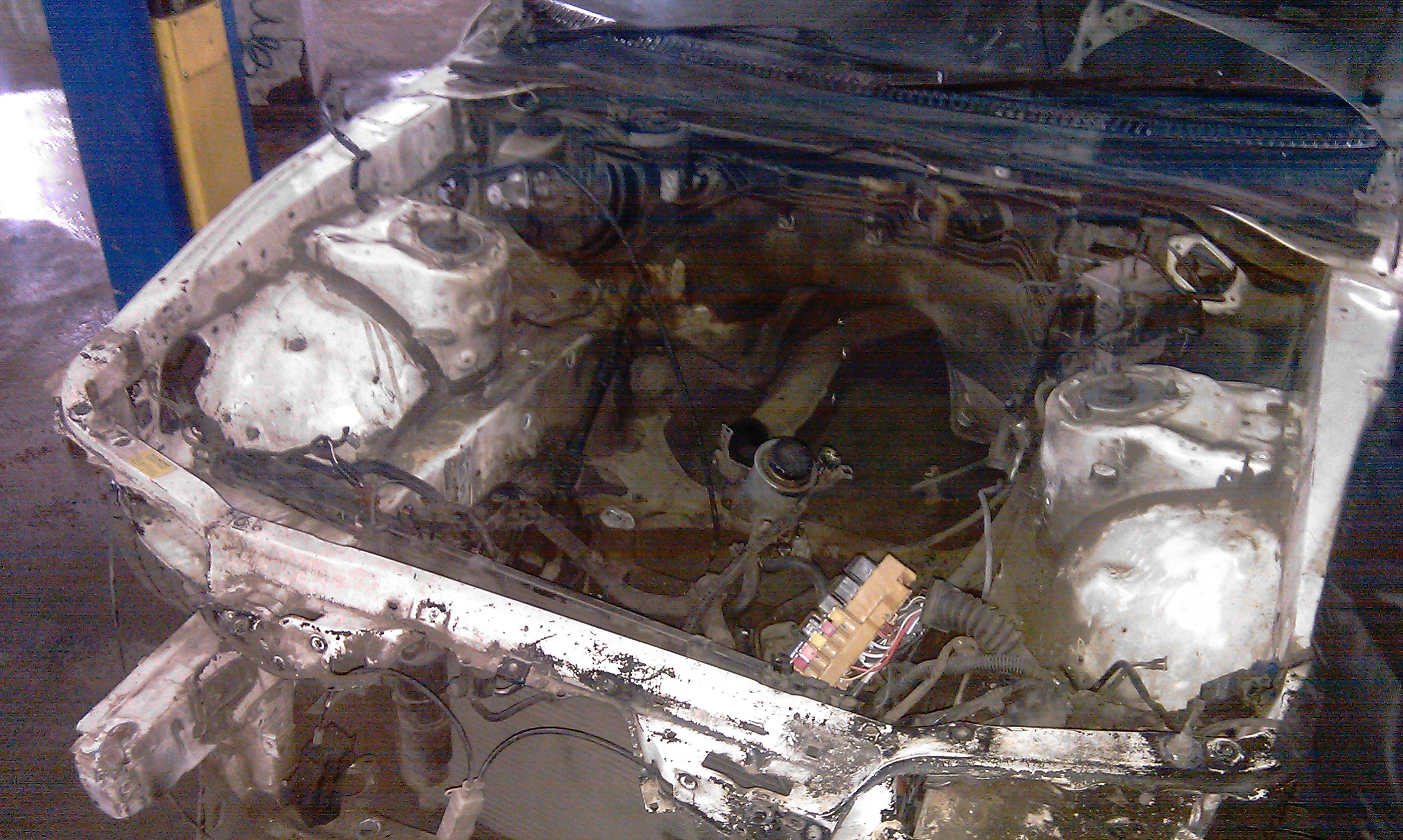 при осмотре нашли косяк на нижнем лонжероне, решили исправлять! что бы поправить его, нужно было снять движок, ну и заодно будет покрашено подкапотное пространство)))