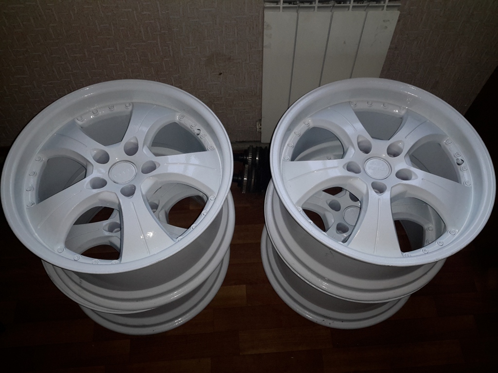 R18 8 1/2 JJ 9 1/2 JJ Стояли на Супре которая пришла с Японии.Изначально были хромированные. Японец покрасил в чёрный. В России перекрашены в белый.Ни разу не ставились в России.Честно говоря покрашены так что лучше перекрасить. Что за фирма колёс не знаю,не нашёл. Цена 24000 р. Фото у меня на страничке,стоят на машине.Уже который раз ни чего не могу залить. http://www.supra-club.ru/board/index.php?s...t=0&start=0 |