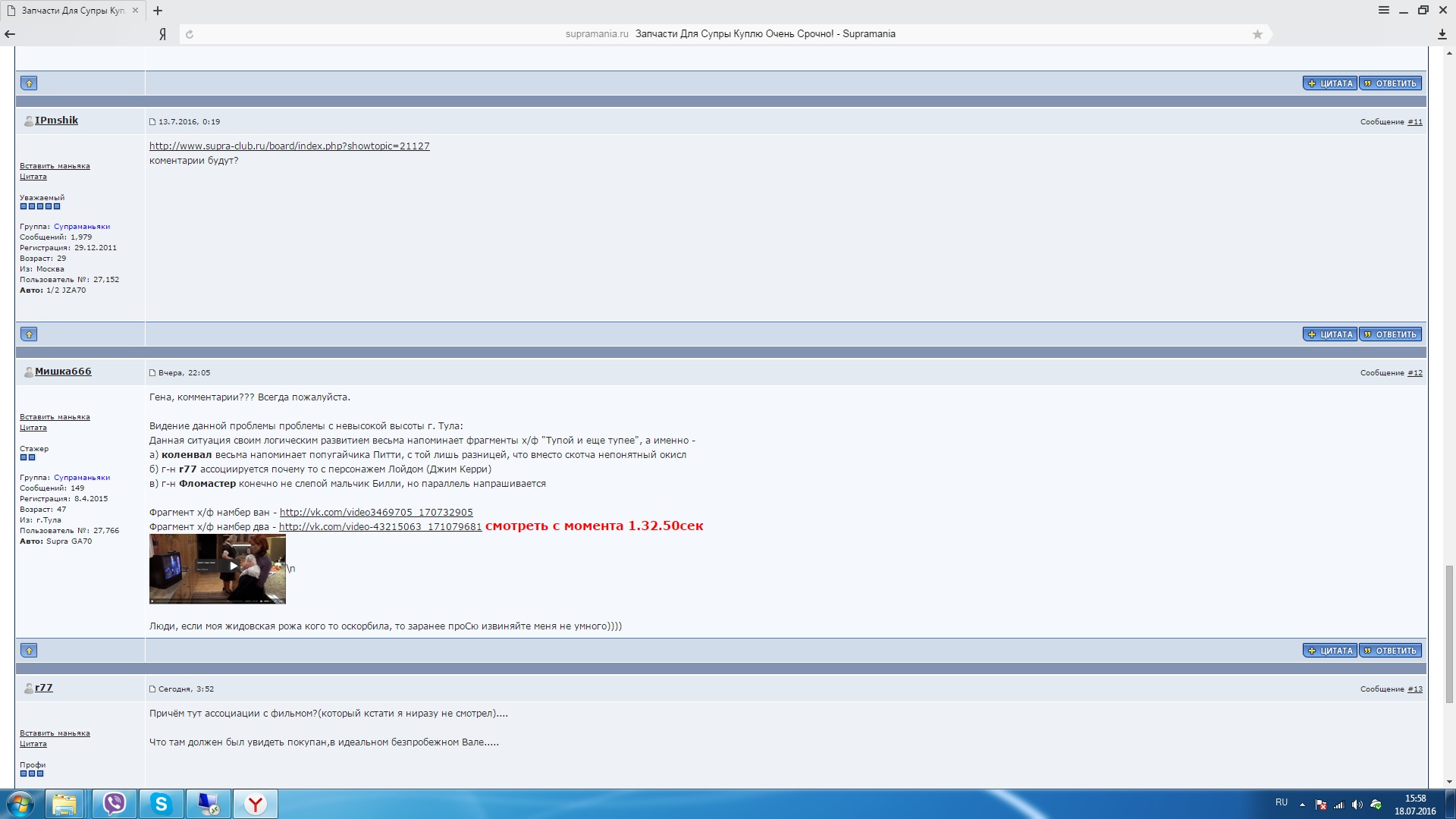 да у нас 70ки и тоже Супры контакт с продавцом в чатике - в котором людям тоже интересно кидала с ними или нет не вижу тут ни какого интереса - кроме узнать правду и вынести справедливое решение - а не устраивать голосование кидала продавец или нет Сообщение отредактировал ipmshik - 18.7.2016, 11:42 |
