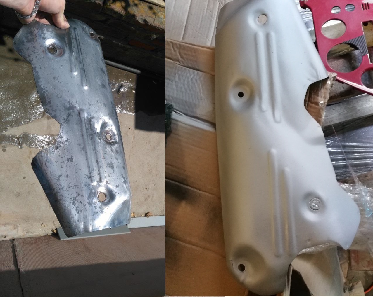 Итак, пока в мастерской работа кипит, уже начинают готовить кузов к покраске, я привожу в порядок то, что посильно малой кровью. Первым делом ковер, долой серый! Будет черный! А так же найден и приведен в порядок ковер багажника, машинка мне досталась без него. Начал зачищать панельки для покраски. Хочу родной черный. Зачистив одну, где то ручками где то насадками, и довольно подзадолбавшись промелькнула мысль что я делаю двойную работу, а не пескоструят ли и пластик тоже? Вопрос риторический, скоро узнаю ответ... Попытка отмыть накладку коллектора успехом не увенчалась, потому окрасил термокраской. Еще предстоит проверить как она поведет себя, но прогрев термофеном на предельном режиме (700 градусов) вплотную в одну точку минут 5-10 не вызвал ни запаха ни намека на горение, эксплуатация покажет... Если кто-то читает это, то видел что багажник был в красном бархате, и пластик тоже, под ним все в клею. Все это, дабы не повредить текстуру, тщательно и аккуратно отмывалось до кровавых мазолей, привет бывшему хозяину, старался сильно не материть Ну и конечно накладочка, куда без нее))) Удалось восстановить до идеального блеска без царапин...теперь зеркало Сообщение отредактировал Goldbyte - 20.8.2018, 23:17 |