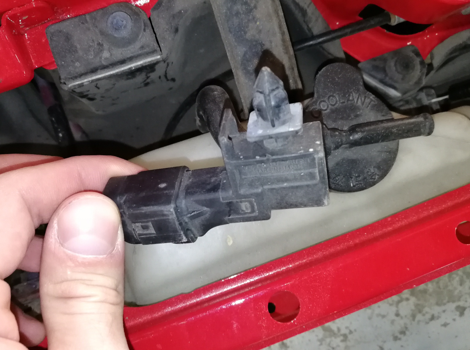 Вопрос такой. Электрик говорит что это датчик температуры который выводит температуру окружающей среды на панель, но мы то знаем что нет таковой (часы дорестайл у меня без кнопки температуры, да и если не ошибаюсь у японцев такой и не было). Вопрос, что это за температурный датчик, для чего. Расположен рядом с расширительным бачком. |