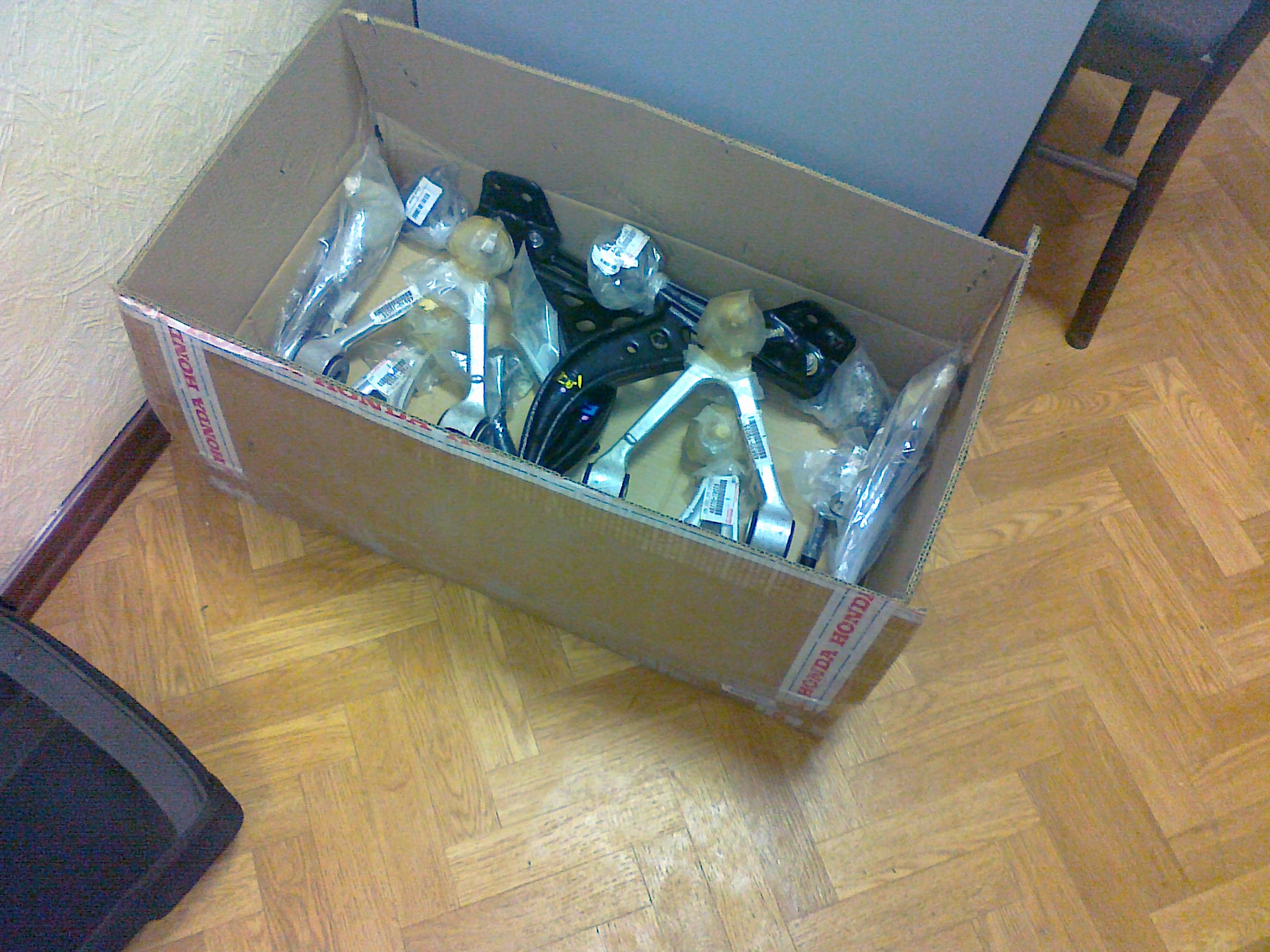 В машине толком ничего не поменял, добавил пару ништяков, да отъездил 30 т.км. Начались проблемы с подвеской. Всякие wheelhop"ы, стуки, бряки, машина стала плохо держаться на дороге. Короче все лето ездил на конкретно убитой подвеске. Долго думал что именно делать с подвеской. Реставрировать шаровую/стойки или купить новую и забыть о турбомоторе ещё на год минимум... В конце сентября колхозные мысли были повержены, и её таки заказал. Ну а собственно сегодня я получил коробочку с загадочной надпись "HONDA", а там... PS Отдельно хотел бы поблагодарить Романа, за запчасти. |
