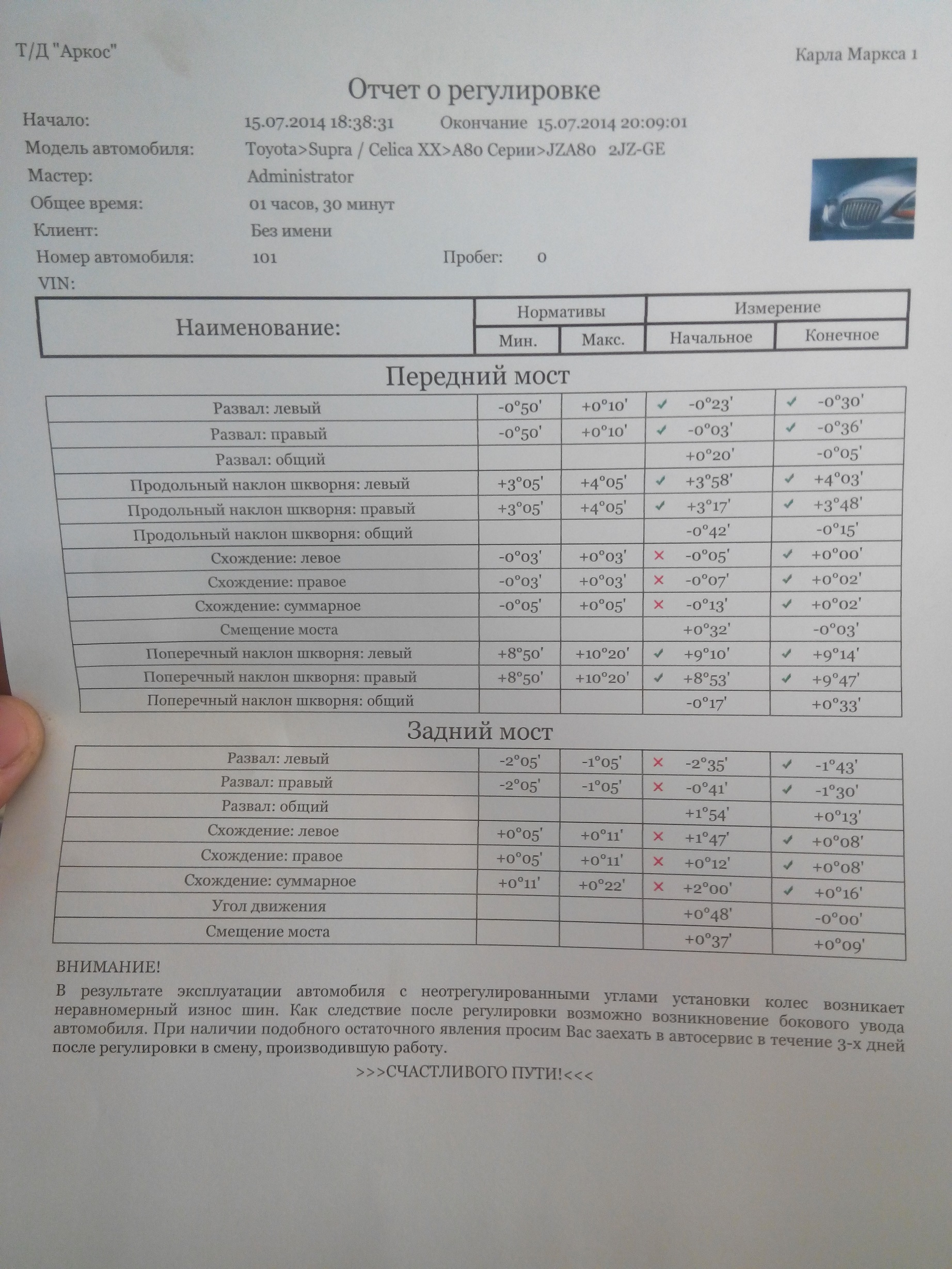 На днях произошол небольшой инцедент..... После непродолжительного углового скольжения, почувствовал отсутствие контроля задней части авто. на подьемнике при осмотре не было выявлено явных признаков гнутых рычагов и ушатанных салентов. Но разница была заметна на глаз На фото здоровое колесо. а вот колесо с дефектом Было принято ехать на развал и попробовать выставить как нужно. ОГРОМНОЕ СПАСИБО МОЕМУ ДРУГУ АНДРЕЮ!!!! Красаучег!!! ИТОГ: Теперь все в допуске и This is GOOD!!! Сообщение отредактировал BaTa101 - 15.7.2014, 21:16 |