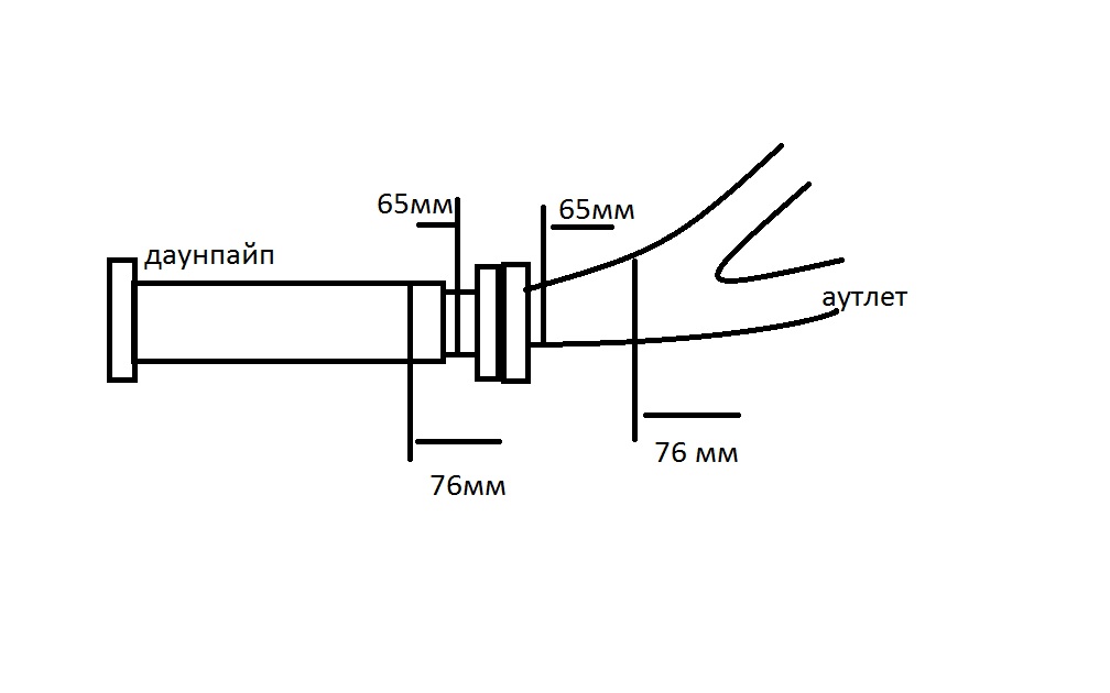 затем купил даунпайп на 76, но поскольку они все имеют заужение до примерно 65 в месте соединения с аутлетом, пришлось и это место в нем убирать и естественно после этого разрезать аутлет т.к. и выход у аутлета тоже 65. И вообщем, если не переделывать аутлет, у которого выход 65 мм под стоковую трубу, большого смысла нет что-то делать (ну может +0.1 прибавится) т.к. у тебя сам аутлет будет душить выхлоп. См. рисунок это так от руки что-бы было всем понятно о чем речь.