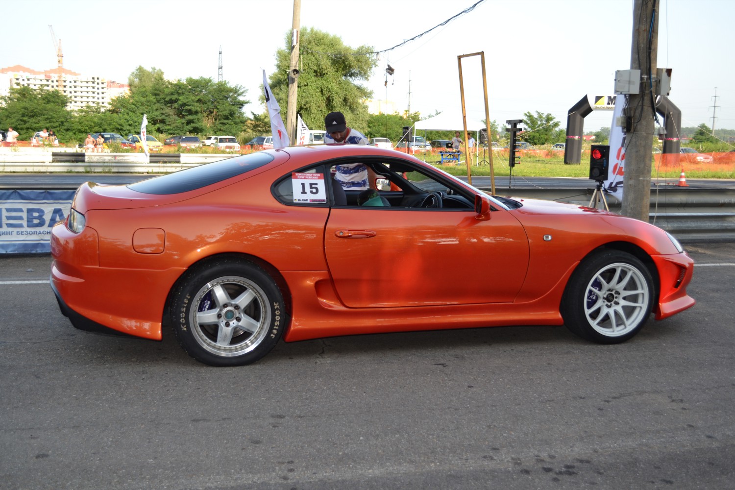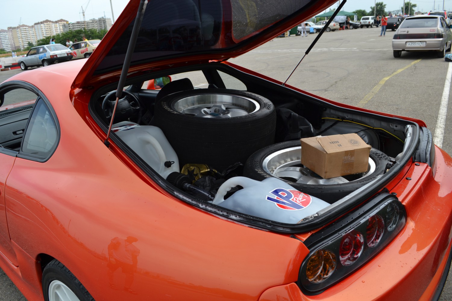 и так начну с того что на Супре не хрена не маленький багажник. пришлось везти все самому так как техничка была занята. загрузил все и поехал в Краснодар. фото уже по приезду. 2 слика 315,35,R17. две канистры 20л. одна пустая другая с бензином. домкрат подкатной и ящик с ключами и автомобильный компрессор для подкачки колес. меняем колеса сливаем бензин АИ98 заливаем VP110 и заливаем калибровку. Выезжаем на пробные заезды, народу мало. классы еле набрались. жара жуткая +40 в тени!!! пробую зацеп, корректирую обороты Лаунч-контроля! делаю 2 пробных заезда и одну квалификацию временем доволен все заезды из 11сек. в одном из заездов решил записать ЛОГ. уже по возвращению домой просматривал. при начале заезда температура во впуске была +45 к концу заезда поднялась до +81 градуса. выводы сделал! тем не мение у меня 1-е место! результатом доволен! 10.7сек но знаю что можно еще не плохо улучшить! сказывается долгий простой Супры в гараже! отвык переключать левой рукой. Видео заезда время 10,7 Сообщение отредактировал Naxys - 22.7.2014, 9:46 -------------------- icq: 632685445