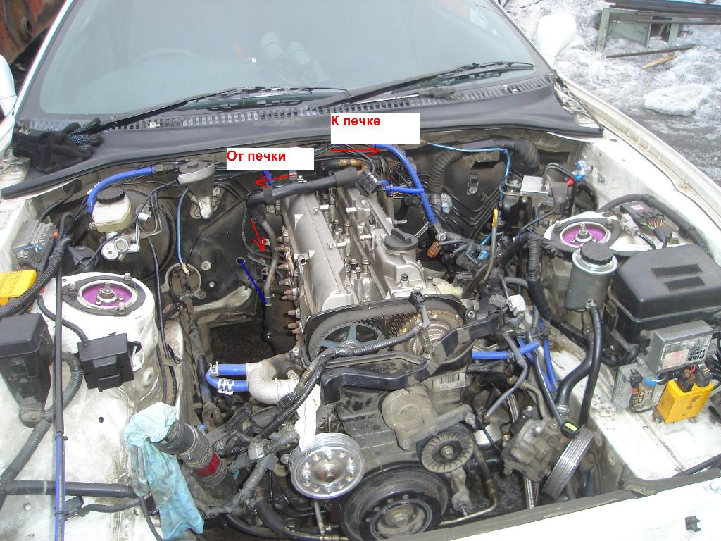 Небольшое пояснение, стоит сингл, т.е. на охлаждение турбины задействован один сосок на гусе и сосок на помпе, также не подключен подогрев дросселя и кхх, точнее шланг м/у 2 сосками брошен напрямую, т.к. авто только летнее.