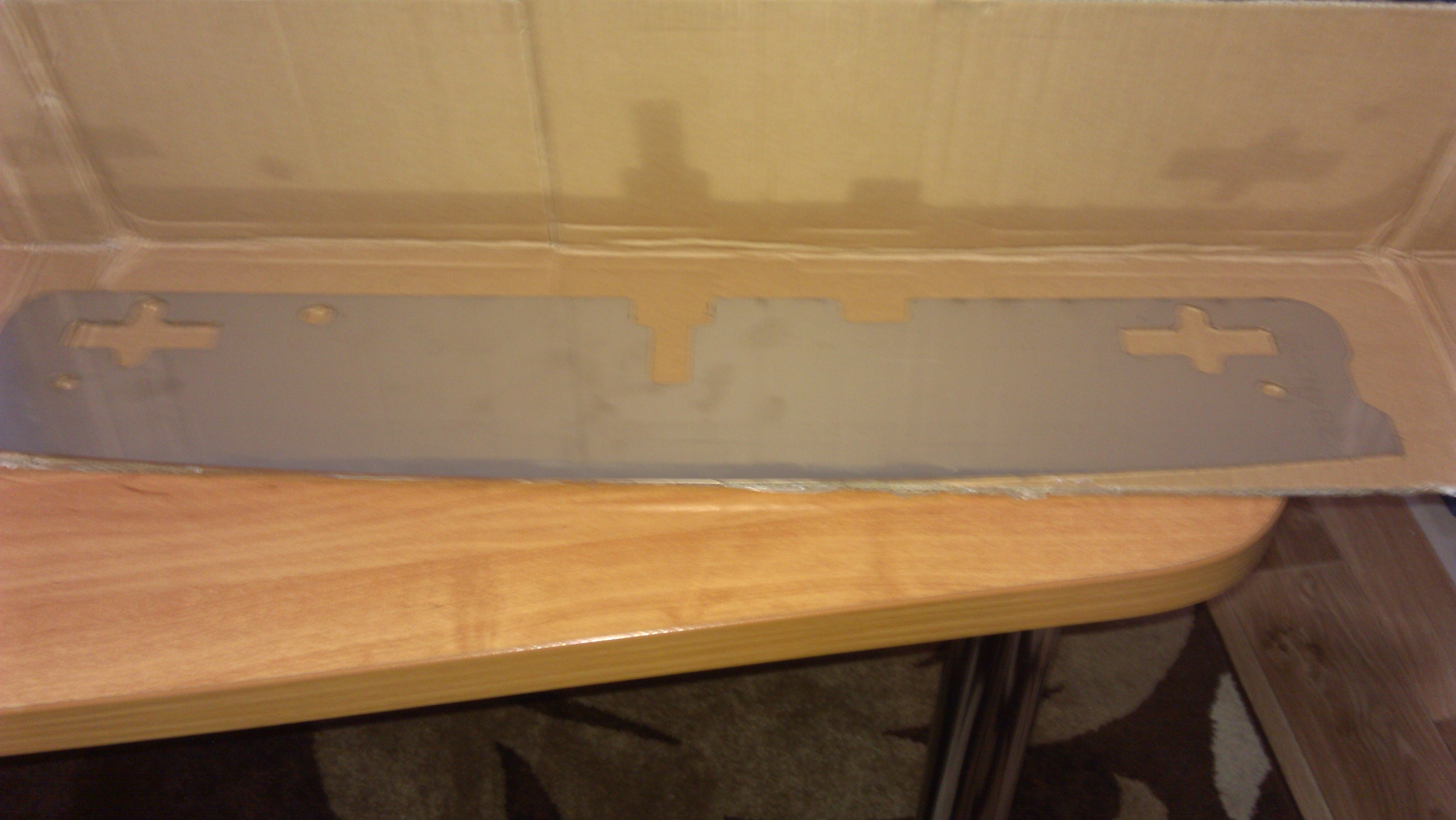 Пришла с Ебей алюминиевая планка планка. Лицевая сторона в защитной пленке. В целом будет красиво смотреться, качество на высоте. Видно что планка не ручной работы, а вырезалась на каком то высокоточном станке.