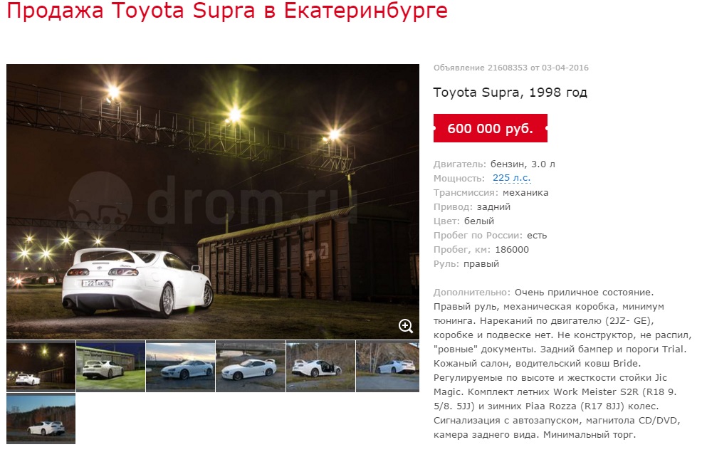 Вот такое объявление сегодня появилось на дроме http://vladivostok.drom.ru/toyota/supra/21745829.html Что думаете? Есть возможность приобрести в качестве донора или в разбор! Но мне кажется что это очередной развод. Реальный ценник или занижен? Какую информацию нужно запросить у продавца? Сообщение отредактировал Sleepyredfox - 15.4.2016, 6:26