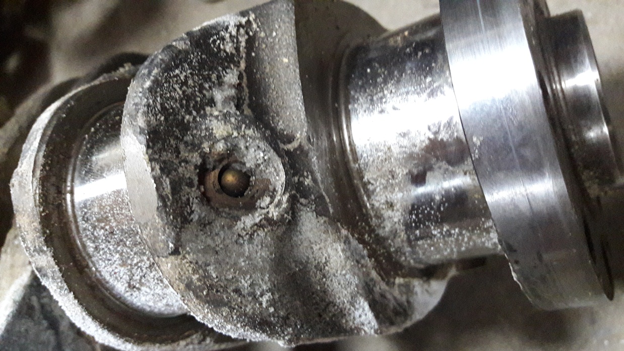 Белый налет это гальваническая коррозия, образуется от соприкосновения разных сплавов металла, могла образоваться от соприкосновения с алюминием, предполагаю что вал лежал на открытом воздухе, на алюминиевом блоке в течении года! хороший пример клемма аккумулятора, под прохождением тока реакция усиливается.