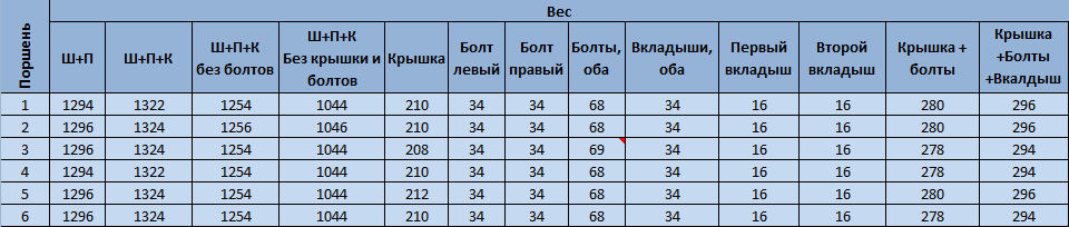 Весы - кухонные, Все данные +/- 1 грамм, т.к. почему-то весы последнюю цифру показывали только четную Ш - шатун П - поршень К - кольца Всё в граммах -------------------- Мой телефон: 8-926-246-91-96
